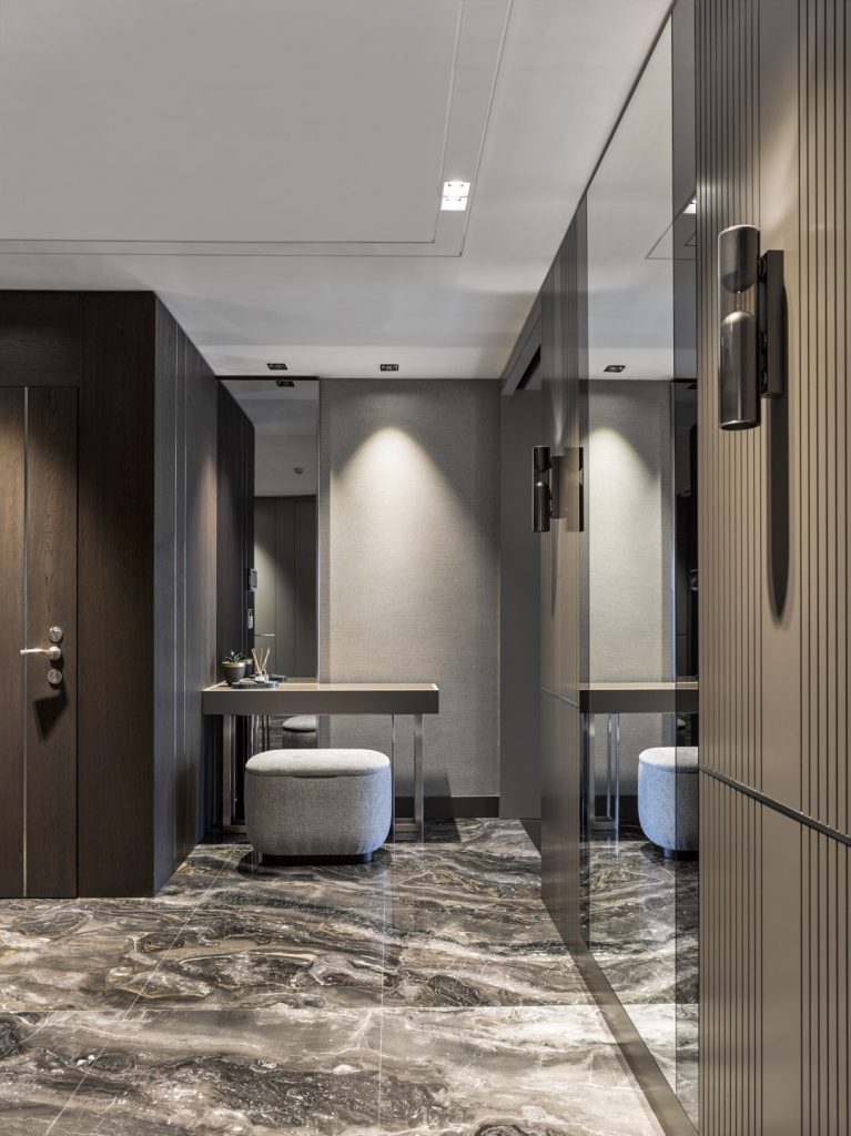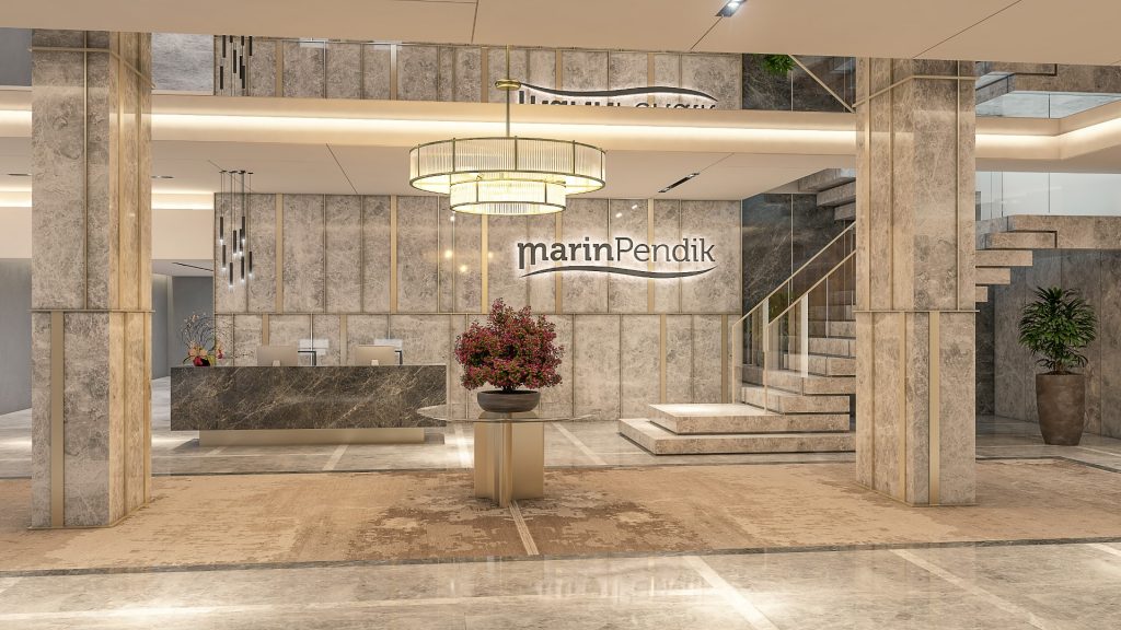 Pendik Burnu’nda yer alan lüks konut projesi “Marin Pendik” projemizin lobi alanında Tundra Grey koyu ve açık renk koleksiyonu kullandık. Taşlar Afyon ve Kütahya bölgesinden temin edildi, Bursa’da işlendi. Tasarımın daha doğal, canlı ve görsel anlamda kaliteli olması adına doğal taş kullanmak istedik. Tasarımını yaptığımız alanlarda detay çözümleri istediğimiz ölçü ve ebatlarda olabilmesi, zamansız bir şıklık sunması, zamanla üzerindeki cila aşınınca tekrar cila yapılarak uzun yıllar parlaklığını koruyabilmesi ve sadece orada bu kombinasyonun yapılarak eşsiz bir bütünlük sağlamayı yakaladık. Yapay ürünler için harcanan kimyasal ürünler ve salınımların da önüne geçilmiş olması önemli bir etkendi. İşveren daha uygun fiyatlı seramik ürünler uygulanmasını istiyordu ancak görsel kalitenin bu şekilde sağlanmasının mümkün olmayacağını söyledik ve çeşitli görsellerle ikna ettik. Fiyat tabii ki etken, ancak binanın kalitesini gösteren yerlerde bu şekilde tasarrufa gidilmesi satış sürecini olumsuz etkileyeceği için taviz verilmemesi gereken konudur, diye ısrarımız sonucu aynen uygulandı. Sonuçta lobi görselleri kullanılarak 1 ay gibi bir süreçte 3-4 tane dubleks daire satışı yapıldı, geri dönüşünün hızlı olması işvereni de mutlu etti. Projelerimizde doğal taş kullanmamızın nedenlerini şöyle sıralayabiliriz: Görsel bütünlüğünün sürekliliği, özgün damar yapısı ile bir bütün halinde kullanılabilmesi, ufak çatlak ve fisürlerin kolayca dolgu yapılarak giderilebilmesi, yoğun kullanım alanlarında dahi cilasının matlaşması durumunda silinerek parlaklığının geri kazanılması, en önemlisi de özgün tasarımlarımızda çizdiğimiz detaylara en uyumlu malzemenin ölçü, ebat, kalınlık sorunu yaşamadan doğal taş ile sağlanabilmesi ve damar takibi yaptığımız ya da “book-matching” yaptığımız özel duvarlarda ise eşsiz bir görsel şölen sunması.
