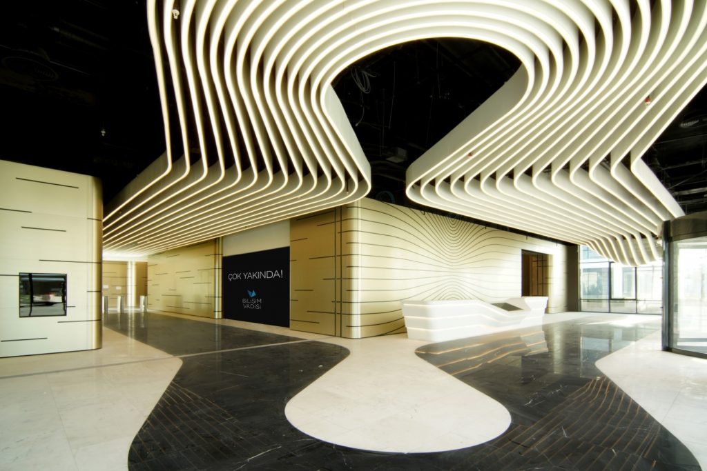 Bilişim Vadisi projemizin giriş ve kat holleri olmak üzere, özellikle zemin döşeme kaplamalarında doğal taş malzemeleri kullanmayı tercih ettik. Projemizin konseptine uygun nitelikte, farklı kontrast renkler oluşturabilmek adına beyaz ve siyah renklerden oluşan, beyaz Afyon mermeri ile Antalya menşeli siyah mermer kombinasyonu kullandık. Bu malzemeler, hayalimizdeki mekan hissiyatının gerçeğe dönüşmesinde oldukça etkin rol oynamış mekan bileşenleri arasındadır. Projemizin konsepti gereği, mekan içerisinde eğrisel formların ağırlıkla kullanıldığı bir biçim dili tercih edilmişti. Mekan bütünselliği açısından, tavanda kullanılan metal asma tavan izini, döşemeye yansıtmak istedik. Bu sebeple döşemede özellikle kontrast renkli malzemelerin seçilmesi, bu vurgunun kuvvetlendirilmesi açısından önemliydi. İlave olarak doğal taşın mekana kazandırdığı doğallık, prestij ve kalite hissiyatı gibi duygular, bizim için estetik ve tasarımsal anlamda oldukça önem arz etmekteydi. Ayrıca bahsettiğimiz gibi bu malzemeler, giriş holü ve kat holleri gibi yoğun sirkülasyonun yaşandığı alanların zemin kaplamaları için tercih edildi. Özellikle bu yoğun trafiği kaldırabilecek, sert, dayanıklı ve az bakım gerektiren malzemeler olması sebebiyle, teknik açıdan da doğal taş tercihimiz bizim için pekiştirilmiş oldu. Bilişim Vadisi projesi ağırlıklı olarak kamunun desteklediği bir projedir. Bu sebeple özellikle yerel malzemelerin tercih edilmesi, işveren tarafından da oldukça memnuniyetle karşılandı. İşverenimizin ikna edilmesi konusunda hiçbir zorluk yaşamadık diyebilirim. Aksine farklı ürünlerde de yerli malzeme kullanımının görüşülmesine örnek teşkil etti. Belirgin bir farkla birinci önceliğimiz doğal taşın mekana kazandırdığı, sağlamlık, güven ve doğallık ve doğallık gibi duyguları bünyesinde barındırması ve mekana yansıtmasıdır. Farklı doğal malzemelerin hiçbiri, tüm bu saydığımız özellikleri bünyesinde barındıran tek bir malzeme niteliğinde değildir. Bu özelliklerinden dolayı da doğal taş, diğer hiçbir malzeme ile kıyaslanamayacak farklı niteliklere sahiptir. İkinci olarak ise yukarıda bahsettiğimiz teknik detaylardan dolayı doğal taş kullanımının yapının ömrünü uzatan ve bakım maliyetlerini azaltan önemli bir faktör olduğunu ifade edebilirim. Özetle, kullanıcıları etkileyecek prestijli mekanlar yaratmak anlamında, doğal taşın oldukça önemli bir mekan bileşeni olduğu görüşündeyiz.