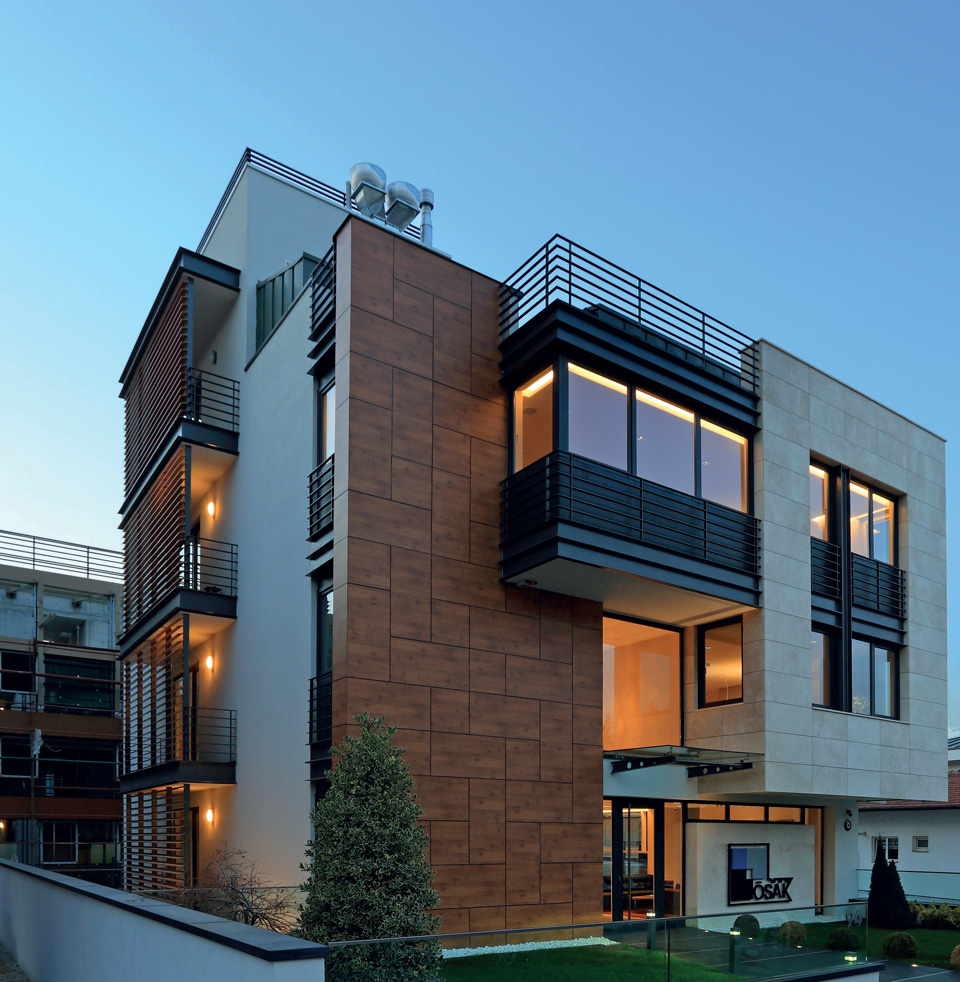 Dolgulu traverten taşı renk ve dokusu için özel olarak seçilmiş, cephe oranları ve çizgilerine uyumlu olarak ebatlandırılarak cephe genelinde kullanılmış… Komşu yapıya bakan sol yan cephe binanın merdiven ve servis hacimlerini çevreleyip olabildiğince sağırlaşırken eğim yönünde yer alan sağ yan cephe, işlek bir cadde olan Reşit Galip Caddesi’ne bakan ön cephe ve komşu yapıya bakan arka cephede çalışma alanları gizliliği ve hâkim Ankara manzarası göz önünde bulundurulmuş. Yapının altı metre mesafeden yan parsele bakan galeri boşluğundaki dış cephesinde hem mahremiyet sağlamak hem de iç mekân zenginliği için çağdaş bir vitray tasarımına yer verilmiş.